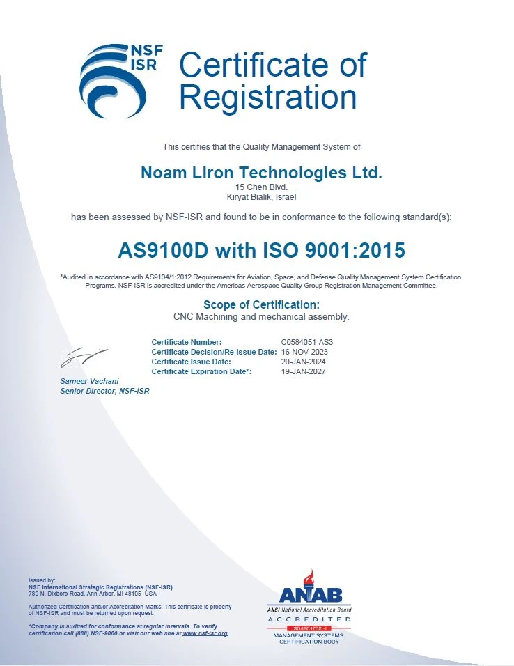 ISO 9001:2015 ותקן תעופתי AS9100D המאושרת ע"י המכון לבקרה ואיכות IQC.